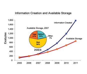 - cette quantité va décupler d’ici 2011, suivant une croissance de 60% / an environ. Cette croissance est principalement due à la TV haute définition et aux caméras de surveillance, mais aussi à l’accès à internet dans les pays émergents, et aux réseaux sociaux.